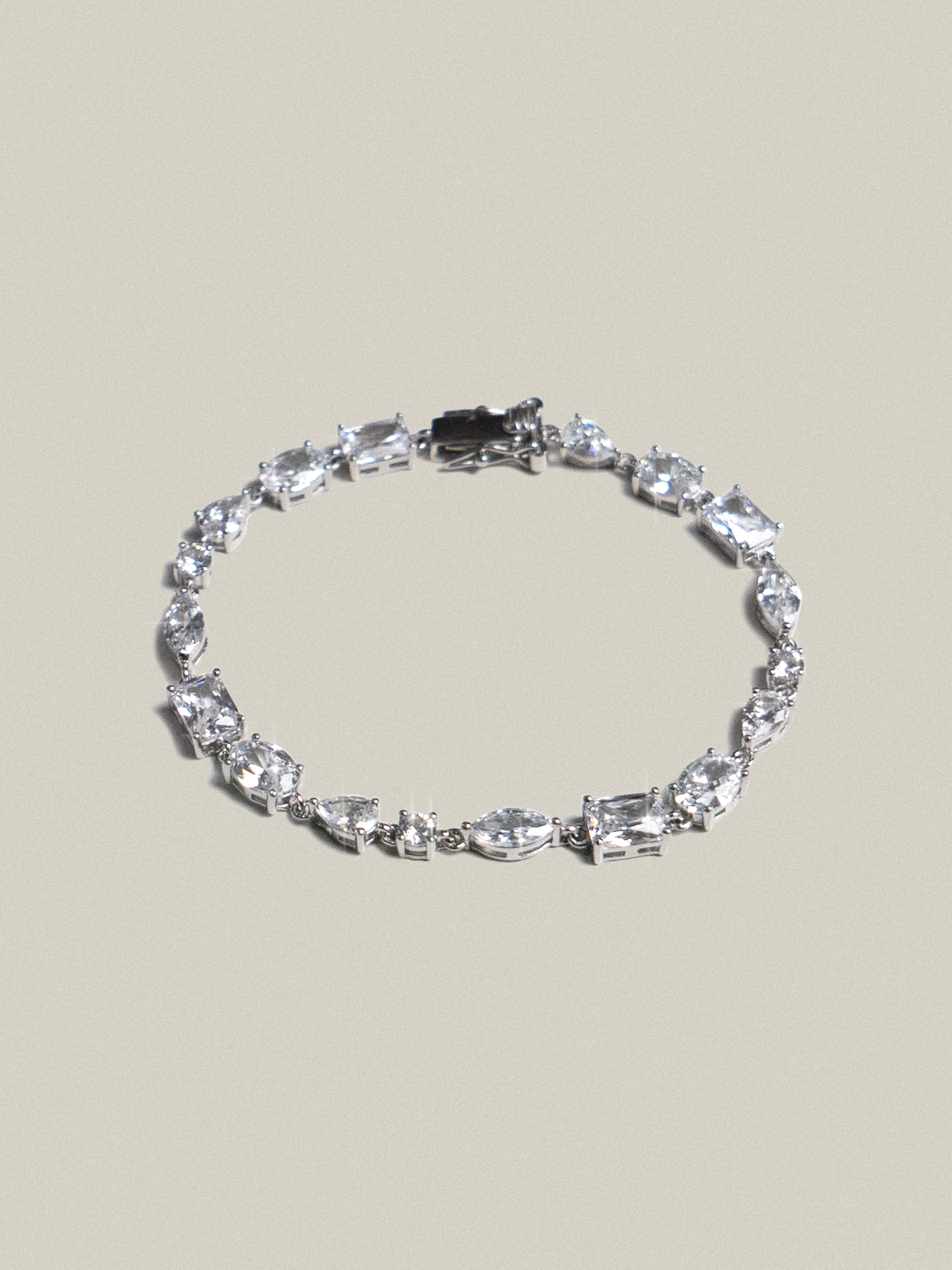 라운드, 오발, 페어, 마퀴즈, 렉탱귤러 컷팅의 화이트스톤이 연속으로 세팅된 팔찌입니다.